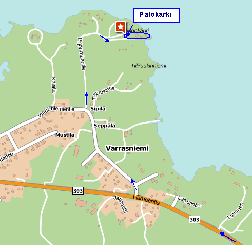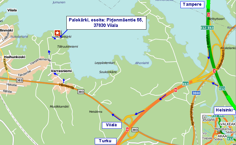1. Aja moottoritien liittymästä nro 32 (Turku/Viiala) valtatielle 9.2. Aja valtatie 9 liittymästä Toijala/Viiala tielle 303 (Hämeentie).3. Aja tietä 303 Viialan suuntaan.4. Käänny tieltä 303 oikealle Varrasniementielle.5. Varrasniementieltä käänny Pirjonmäentielle (jossa opaste ”Palokärki”).6. Palokärjen kiinteistöt löydät ajettuasi Pirjonmäentien perille.Instructions how to find ”Palokärki”:When arriving from Helsinki-Tampere highway (E12):1. While driving on E12, take the exit number 32 to E63 (“Turku/Viiala”).2. While driving on E63, take the first exit to “Toijala/Viiala”.3. At the crossroads to road 303 (“Hämeentie”), turn right to Viiala.4. Drive along 303 until the crossing to “Varrasniementie” on the right.5. Drive along “Varrasniementie” until the crossing to “Pirjonmäentie” on the right, where you also see the sign “Palokärki”.6. You’ll find the buildings of Palokärki at the end of “Pirjonmäentie”. (See the attached maps for details.)